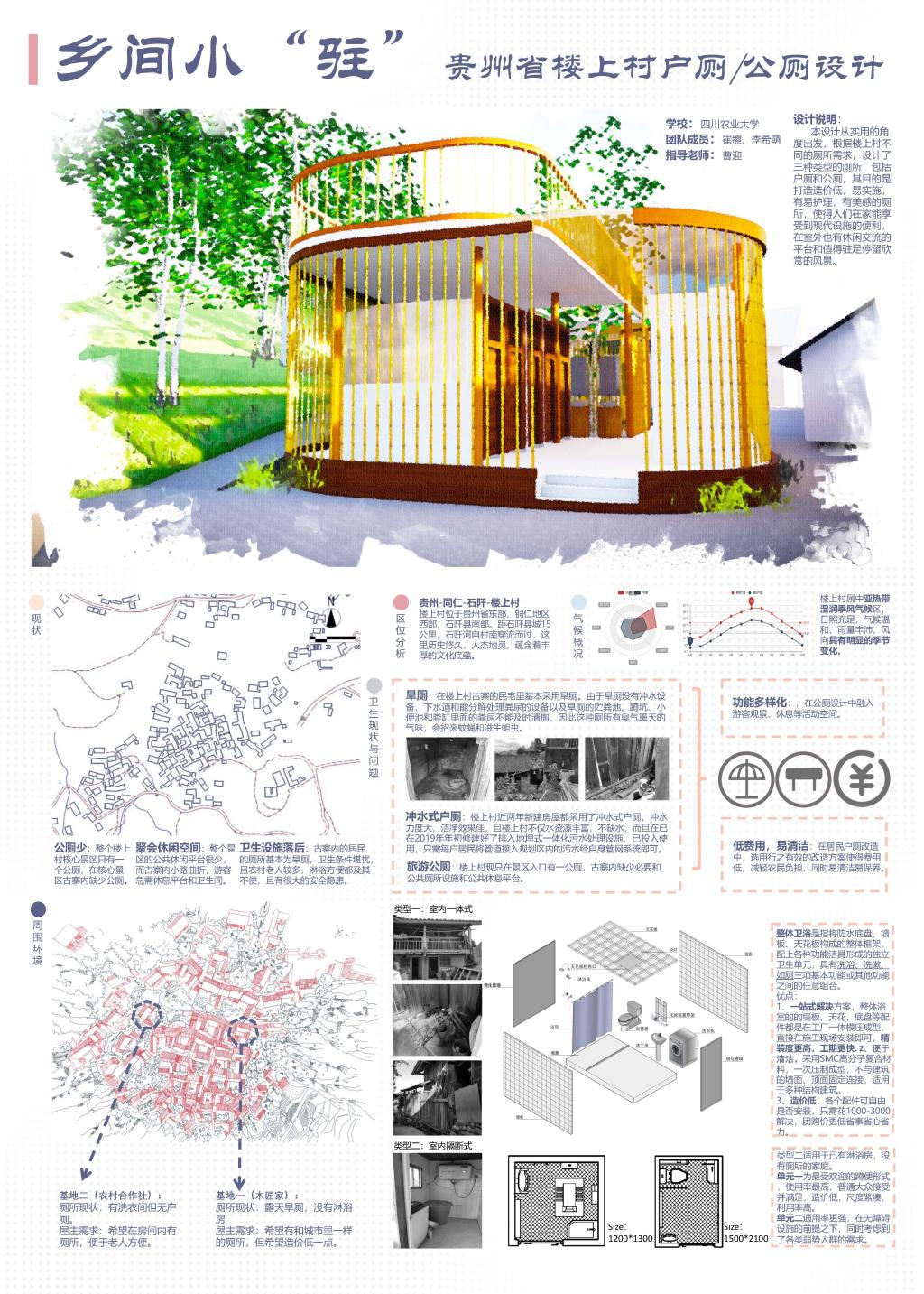 调研结束后,团队成员马不停蹄地进行数据整理,情况归纳以及基础图纸模型的绘制,总结出室内一体式、室内隔断式、室外独立式3种户厕类型,并对应到具体农户进行改造设计。结合村落空间节点和居民实际需求,团队成员选定了一处位于村落主要交通节点的室外独立式厕所,意在改造成一所与当地建筑风貌相融合,结合休憩庭院、观景平台,传递新型的厕所观念与当地文化宣传,采用当地传统建筑材料进行创新应用,造价适宜、节约能源,同时兼顾不同对象使用的综合性厕所。设计作品历经三个月的不断修改完善,获得此次竞赛专家评委的肯定。