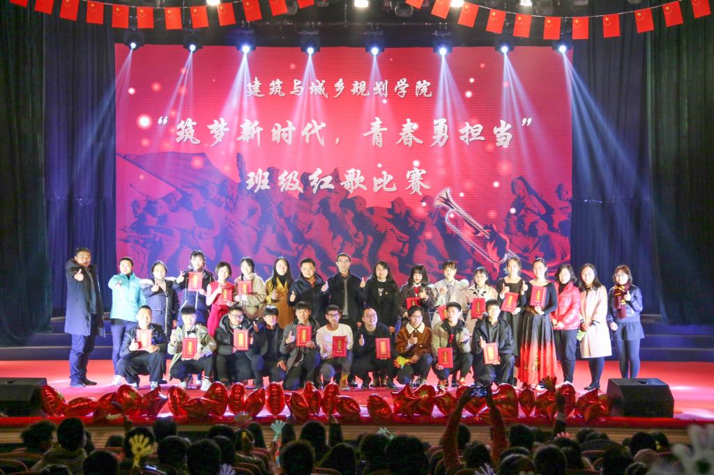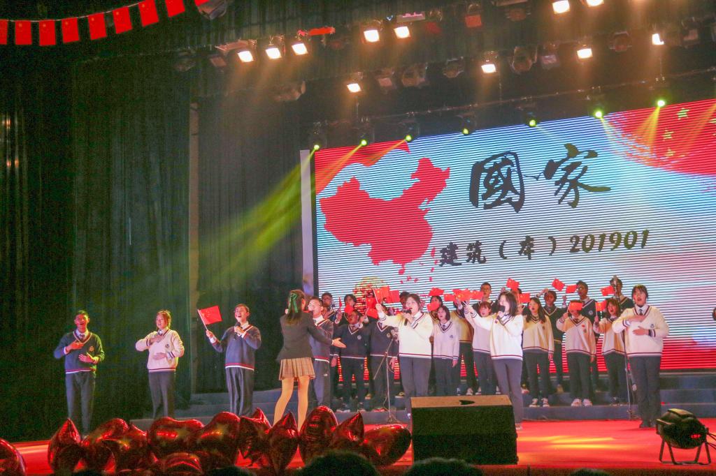 历经近两个月的排练以及严格的选拔,最终共有16个班级挺进决赛。各个参赛班级全力赴赛,不仅在歌声技巧方面相互竞争比拼,更在表演形式上追求创意新颖。抑扬顿挫的朗诵、余音绕梁的独唱领唱、优雅妙曼的伴舞……让同学们的表演别具一格、动人心弦。“国的家住在心里,家的国以和矗立;国是荣誉的毅力,家是幸福的洋溢”建筑(本)201901班将手语贯穿在歌曲里,一双双手搭建的屋檐就是心中的家国;城规(本)201801班演唱《我爱你中国》采用无电声伴奏的形式,加入钢琴伴奏和非洲鼓,将歌曲演绎出青春的色彩;“让海风吹拂了五千年,每一滴泪珠仿佛都说出你的尊严,让海潮伴我来保佑你,请别忘记我永远不变黄色的脸”工程(本)210703班全体同学用声情并茂的歌声传达出对祖国母亲的款款深情,也感染了在场的每一位观众。