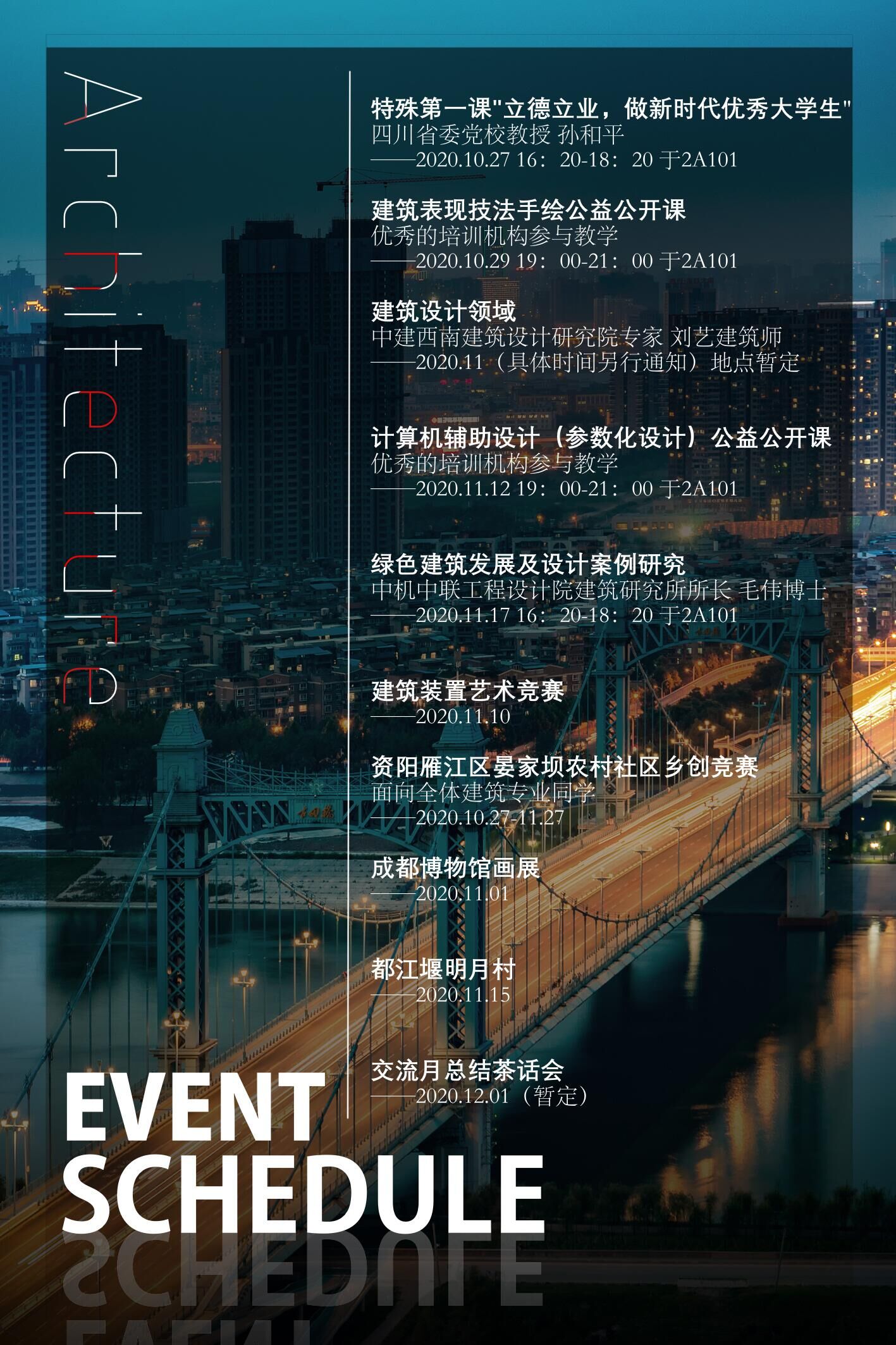 为提高建筑学专业学生对于本专业的了解,进一步加深对建筑审美的理解与职业道德的认识,beat365建筑系将在2020年10月27日至11月27日开展“建筑交流月”活动,该活动将从专家讲座,参观实践,专业竞赛三方面进行。