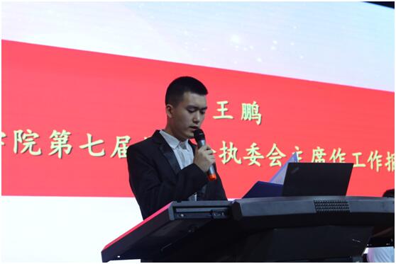 第七届学生会主席王鹏同学,在会中作了《引领思想潮流,培育青春梦想》的工作报告,报告中提到,学院学生会在院党委的领导下,在院团委的具体指导下,坚持“自我教育,自我管理,自我服务,自我监督”的“四自”方针,发挥学生会作为“学生之家,师生之桥,干部之校”的作用,坚持锐意创新、与时俱进、务实求真的态度,并希望在一届又一届学生会的共同努力下,学院永葆活力,砥砺前行。