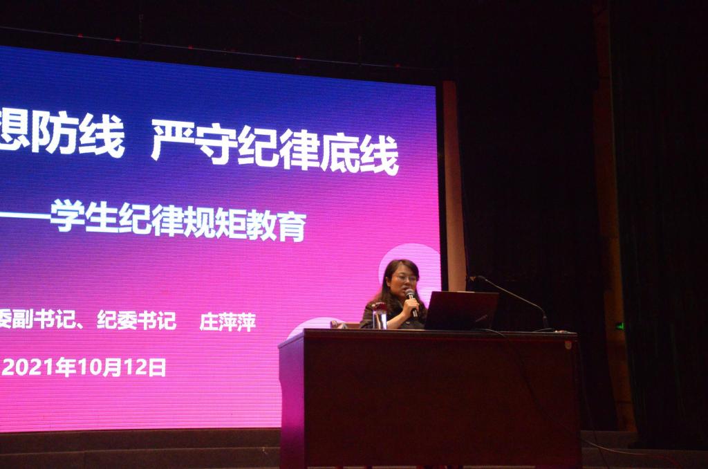 10月12日下午,建城学院在学生活动中心开展了以“筑牢思想防线、严守纪律底线”为主题的纪律规矩教育专题讲座。本次讲座由学院党委副书记、纪委书记庄萍萍主讲,她从大学生纪律规矩的重要性、当代大学生纪律规矩意识现状、纪律规矩教育的主要内容、如何加强纪律规矩意识的培养等方面展开。全体大一新生、高年级各班学生代表及研究生代表共500余人参加讲座。