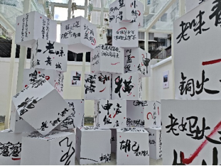 开幕式现场,代表艺术家刘大亨对作品进行了导览。他表示,此次进行展览的装置作品与都江堰的地方文化高度融合,设计充分考察了地方文化、艺术和社区生活的基本关系与表达。策展人张钟萄介绍,“从村口的树到社区公园”是2023年成都双年展平行展的一部分,它关注都江堰市蒲阳路社区在城市更新与社会建设过程中的人地变迁。艺术家团队从今年5月中旬开始对蒲阳路社区所在地的原住村民进行走访,并开展相关文献查阅,进而整理出由旧有村庄向新型社区演变的过程。值得一提的是,原有的文化和交流空间,从标志性的大树变为功能更丰富的社区公园,这一特点也是整个成都的城市与地方文化建设的经典缩影。