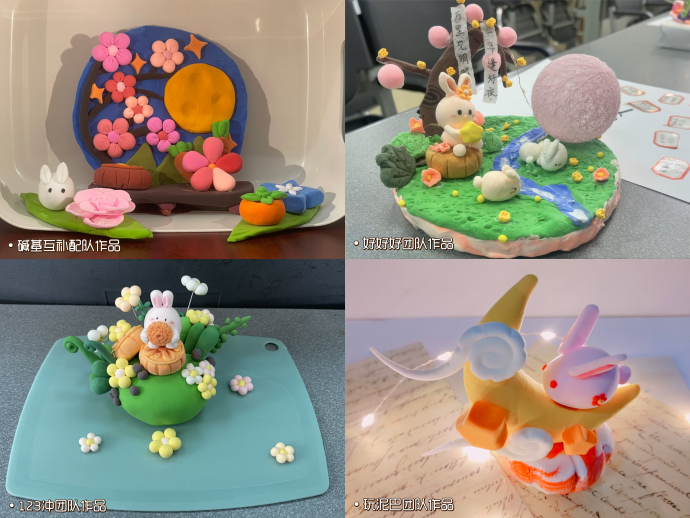 活动中,各参赛团队充分发挥创意,用黏土材料制作中秋节主题摆件,将圆月、玉兔、桂树、月饼等中秋元素进行组合搭配、点缀设计,搭建中秋场景,传递中秋祝福,分享节日感悟,弘扬中国优秀传统节日文化。“好好好队”队长周文雯表示,“年逢好夜,万里见明时”,团队成员以“桂香醉芬芳,月免相伴”为主题,表达了人们在远方寄思念于月光,托月亮送到故乡的寓意。“123冲!”团队则以兔子为主体,以月饼突显中秋主题,胸前举起的圆圆的月饼意味着团团圆圆,而月饼下长满鲜花和绿植的绿色星球则象征着绿色环保的理念。整体作品寓意着种花家一点不能少,各地人民团圆共庆中秋,并且要向着绿色生态环境发展。