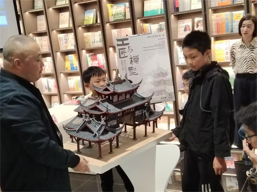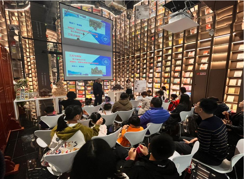 11月4日下午,首期主题为“工匠与模型——谈崇宁县杨氏木匠初修望江楼”的讲座在钟书阁书店拉开帷幕。我院廖勇超老师作为特邀主讲人,围绕望江楼、南桥、青城山六角亭等著名建筑进行深入讲解分析,给在场观众带来一场建筑文化方面的知识盛筵。他以生动的故事切入,将学院制作精良、结构严谨的建筑模型进行展示,详细介绍建筑构造中的精妙细节,引导观众探究建筑的内部结构,发现中国古建筑之美。此外,他还为观众解答了关于都江堰鱼嘴、二王庙等本地著名建筑的相关疑问,让大家对身边建筑的构成原理与文化内涵有了更加深刻的理解。最后,在廖老师的带领下,观众体验了简单的建筑模型制作。