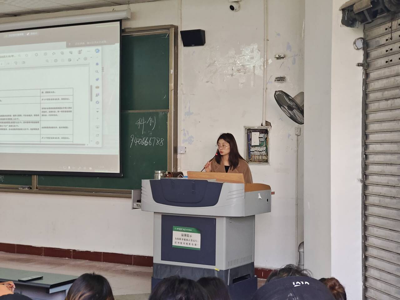 会上,马双老师详细解读本次社会实践相关文件,重点讲解“返家乡”社会实践活动,鼓励同学们将社会实践与创新创业赛事相结合,以社会实践作为前期准备,将实践成果转化为科技创新竞赛作品,深入地方党政机关、事业单位一线岗位,力所能及参与基层治理日常工作。她分享了往年我院的优秀实践团队事例,号召同学们向“红色旗帜”看齐,向优秀团队学习,善于挖掘“小事情,大立意”的实践项目敢于创新,善于总结,在实践中“受教育、长才干、做贡献”,提高综合能力。