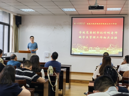 5月21日下午,我院在2C405召开学院班主任大会,就学生管理工作和近期本科教育教学审核评估工作做了相关安排部署,学院党委书记申琼、党委副书记付刚、全体班主任参加会议,会议由党委副书记付刚主持。
