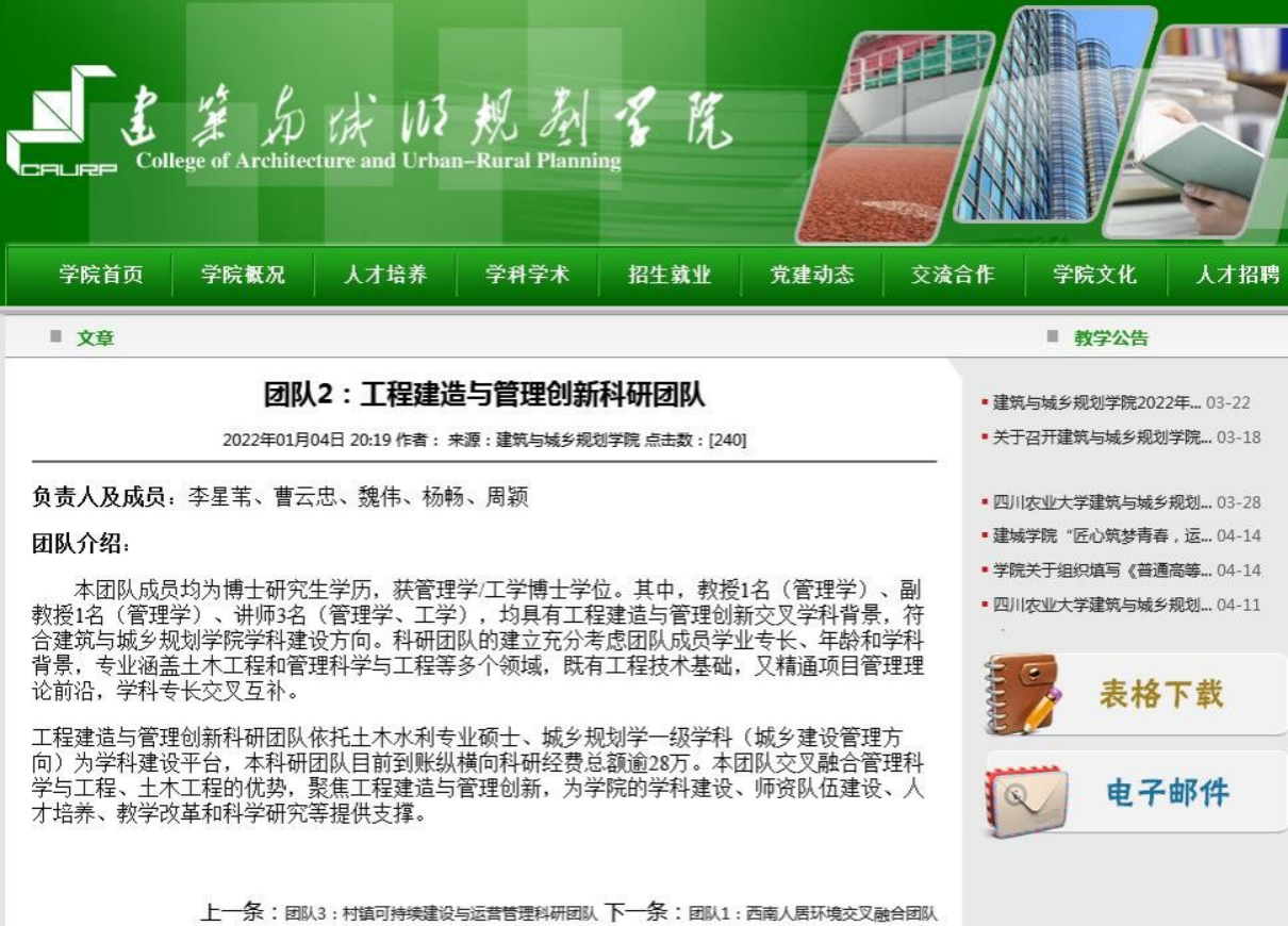 据悉,工程建造与管理创新科研团队负责人及成员由李星苇、曹云忠、魏伟、杨畅、周颖组成, 该团队成员均为博士研究生学历,获管理学/工学博士学位。其中,教授1名(管理学)、副教授1名(管理学)、讲师3名(管理学、工学),均具有工程建造与管理创新交叉学科背景,符合四川农业大学beat365学科建设方向。该科研团队的建立充分考虑团队成员学业专长、年龄和学科背景,专业涵盖土木工程和管理科学与工程等多个领域,既有工程技术基础,又精通项目管理理论前沿,学科专长交叉互补。工程建造与管理创新科研团队依托土木水利专业硕士、城乡规划学一级学科(城乡建设管理方向)为学科建设平台,本科研团队目前到账纵横向科研经费总额逾28万。本团队交叉融合管理科学与工程、土木工程的优势,聚焦工程建造与管理创新,为学院的学科建设、师资队伍建设、人才培养、教学改革和科学研究等提供支撑。