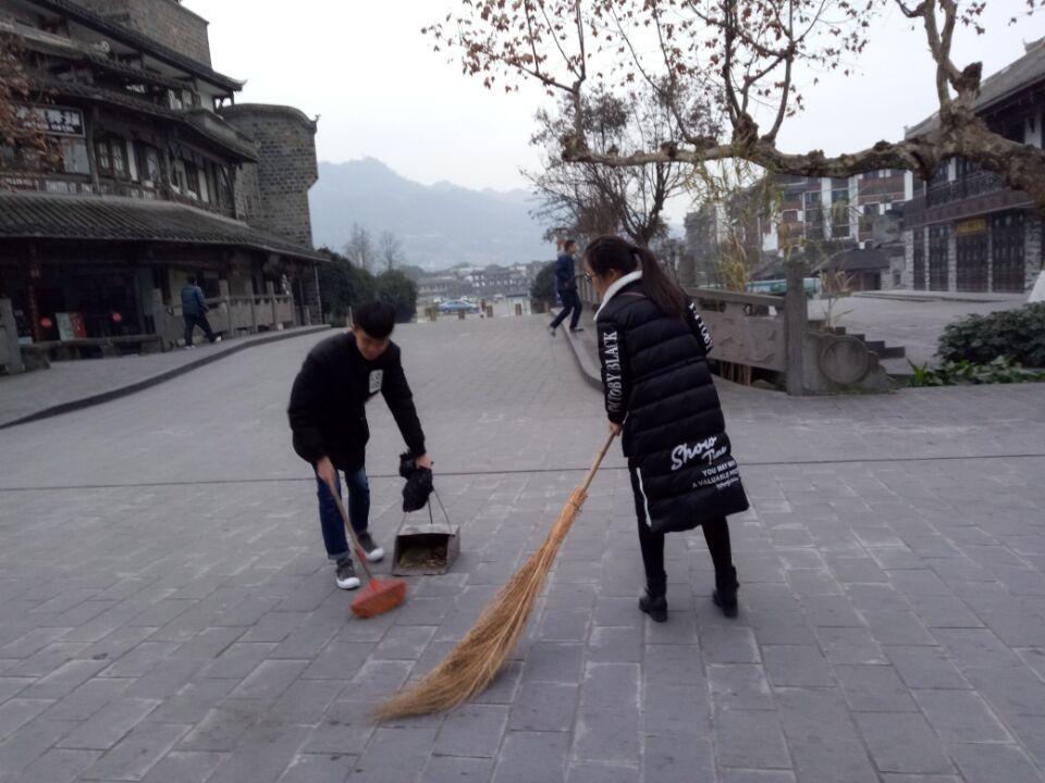 同学们带上“行动武器”后,便出发来到了都江堰市幸福路的步行街。大家分组分段进行道路的清扫,为环卫工减轻负担。1个小时左右的清扫工作让同学们感受到了这份平凡工作的不易和伟大。美丽的旅游城市——都江堰,由这一条条干净宽阔的道路交织而成,若是少了这些城市美容师的辛勤劳作,城市便仿佛是失去了一件干净整洁的外衣。劳动结束后,同学们纷纷自觉地当起了城市美容师——看见其他道路上的垃圾,都会不自觉地弯腰捡起。