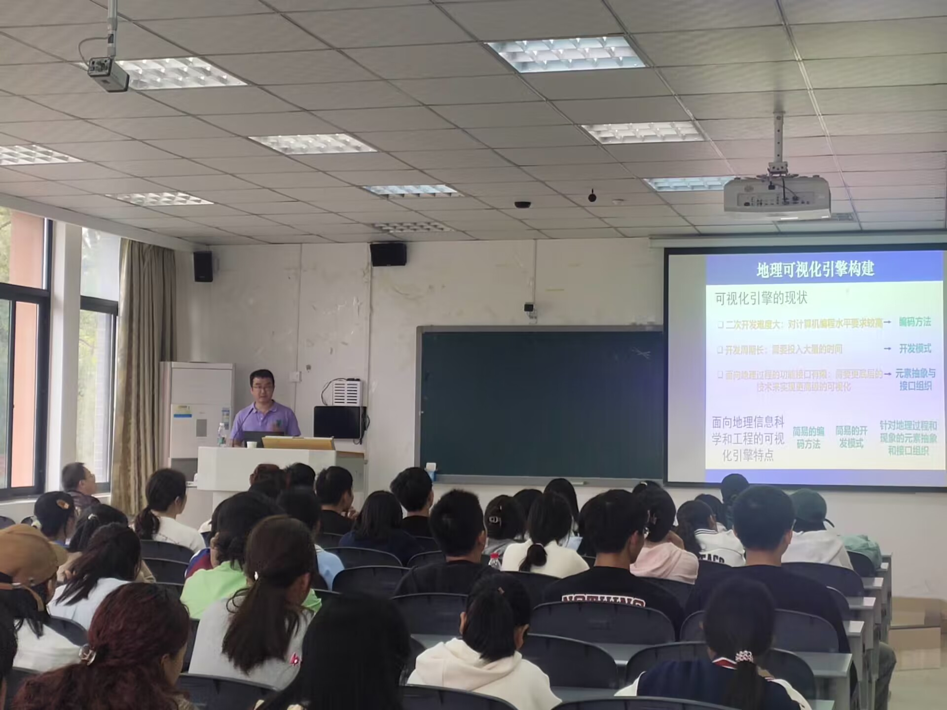 9月28日下午,陕西师范大学彭国强博士、曾任51World成都研发中心创始人兼技术总监,应邀来我院进行学术交流,并为学院师生作了题为“从地理可视化到数字孪生”的学术报告。学院本科生、研究生及教师代表共70余名师生参会,报告会由院长曹云忠主持。